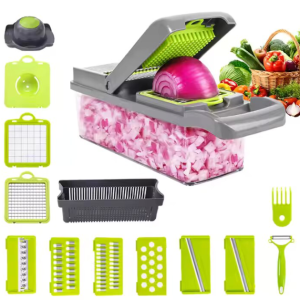 24/bax-Tocator Legume si Fructe 13 in 1, Mandolina Multifunctionala, Razatoare si Feliator Ceapa, Morcovi, Cartofi, cu Recipient Colector si Cos de Scurgere, Accesorii Diverse, Gri