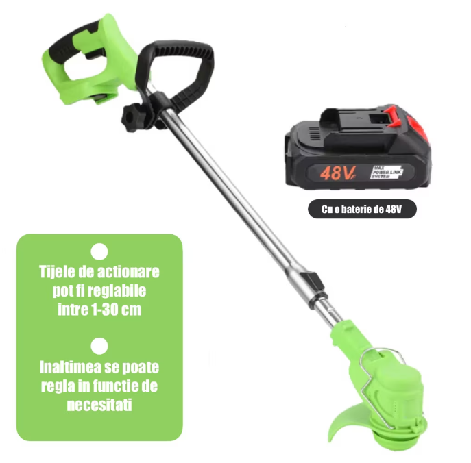 Motocoasa Electrica Profesionala SUPER TRENDS®, 1500W cu 2 Acumulatori 48V, Roti Detasabile si 3 Unghiuri de Taiere, Design Rezistent din ABS si Metal, Verde